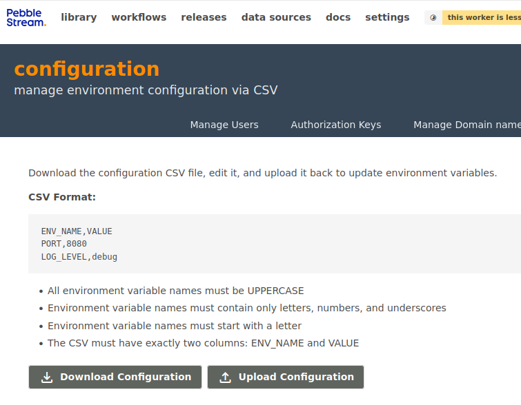 With release 2.4, you can manage Flow's environment variables via CSV-formatted property files. Download the existing configuration, make changes, and upload the changed CSV file. Flow will validate all configuration variables before allowing the update.